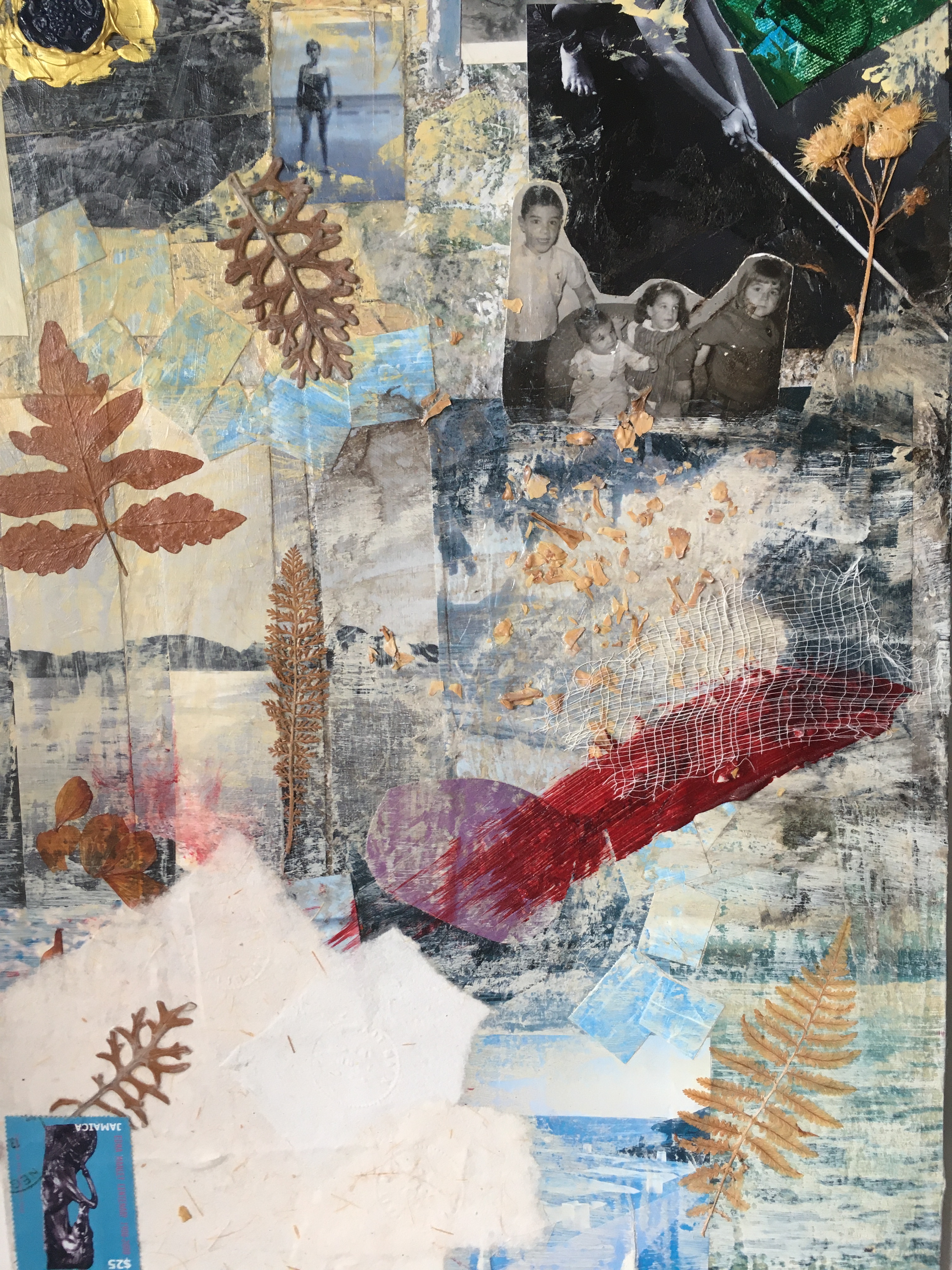 À l’époque de nos fréquentations, je créais des collages auxquels j’intégrais les trouvailles que je rapportais de mes prés environnants et des bric-à-brac laurentiens. Voyant peut-être quelques mérites à mes bricolages ou au bonheur qu’ils me procuraient, Marilyn y a contribué en extirpant de ses mille et un placards nombre de magazines des années quarante, de registres de soirées mondaines qu’elle tenait de je ne sais qui, et même de billets de spectacles déchirés qu’une Lady d’un autre siècle avait précieusement conservés.